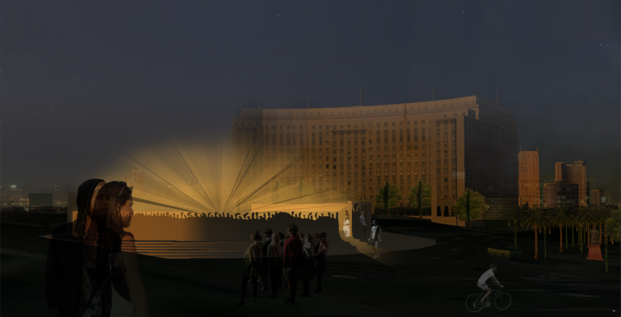 The driving aspects for this project were to represent the intention, culture and lost lives yet ever-lasting spirit of the revolution. The intent is reflected in the location of the site selected; it is at the heart of the square in front of the Tahrir Government Complex, as if it is marking territory. The culture being peaceful and collaborative, peacefulness represented by the neutrality of the white color cladding, and the collaborativeness represented in its circular walls depicting unity between people. The lost lives, yet ever-lasting spirit, was reflected by wall silhouettes and shadows. On the inner surface of the walls, the names of the martyrs are engraved.