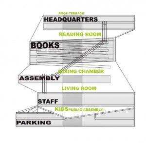 The section and plans of the building design are based on its program’s spatial necessities, the main concept was to create a building whose structure is defined by its program rather than a building whose structure defines how the program should be distributed. Among the buildings main spaces is the Book Spiral, which was designed to help create an uninterrupted organizational system for the book collections, expansive range from 000-999. In the plans we see that interior levels are not purely horizontal nor isolate from one another but rather are bent and shaped to create spaces within space. For example the second level creates interesting areas and corners that act as indoor public space platforms for different happenings from the social to the quite and studious.