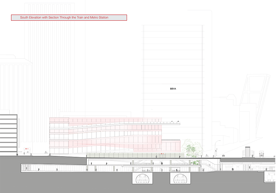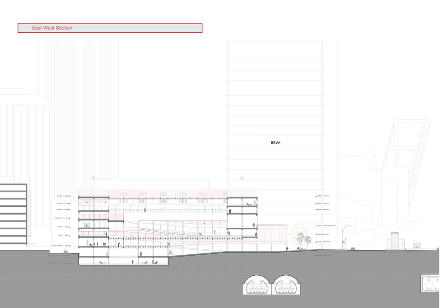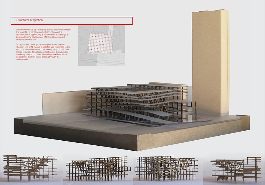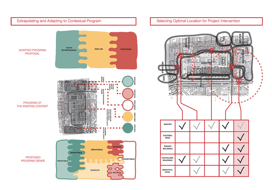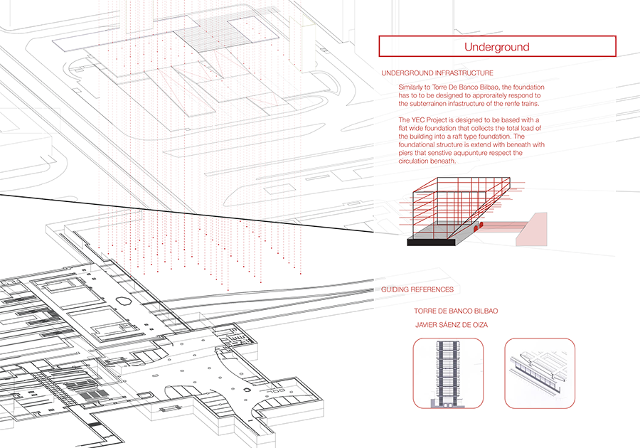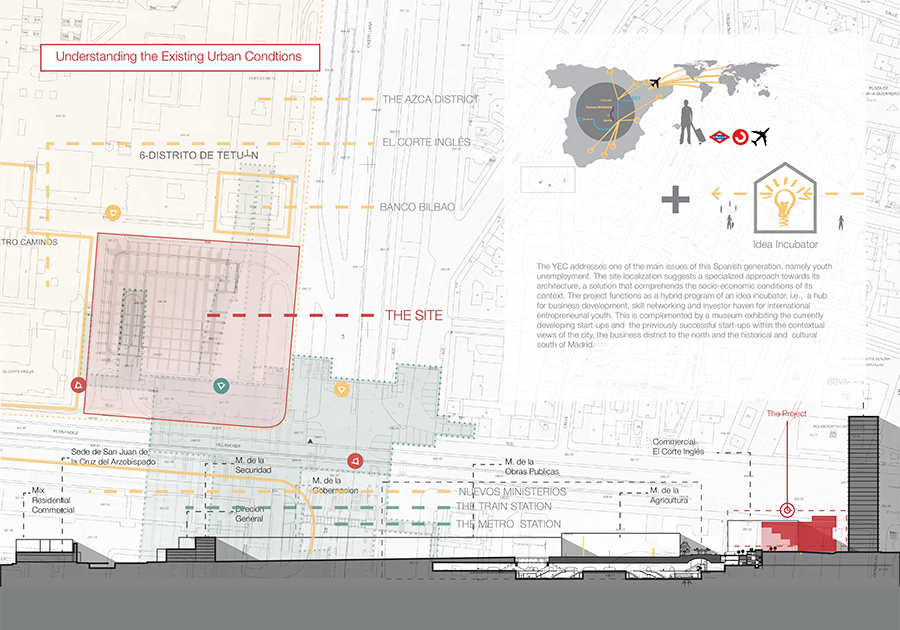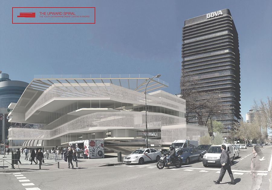 The project functions as a hybrid program of an idea incubator, i.e., a hub for business development, skill networking and investor haven for international entrepreneurial youth. This is complemented by a museum exhibiting the currently developing start-ups and the previously successful start-ups within the contextual views of the city, the business district to the north and the historical and cultural south of Madrid.