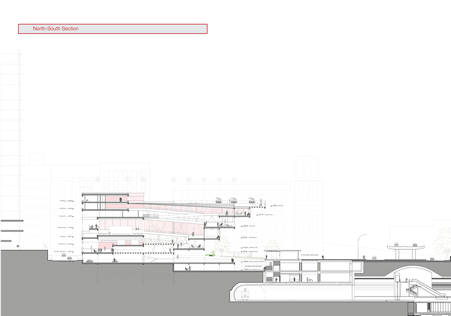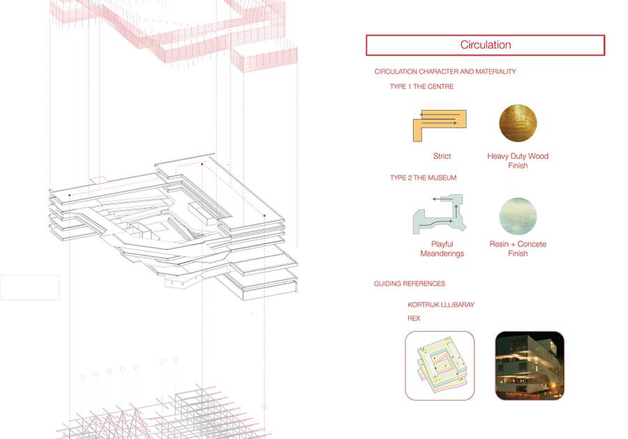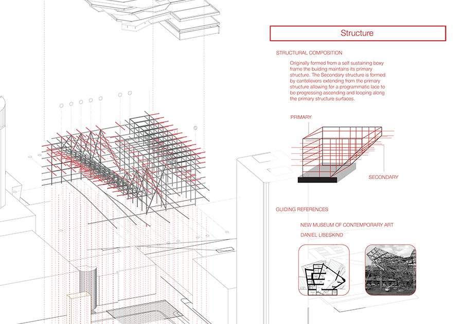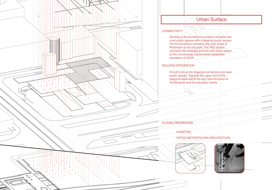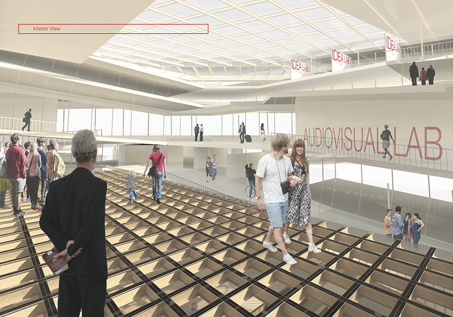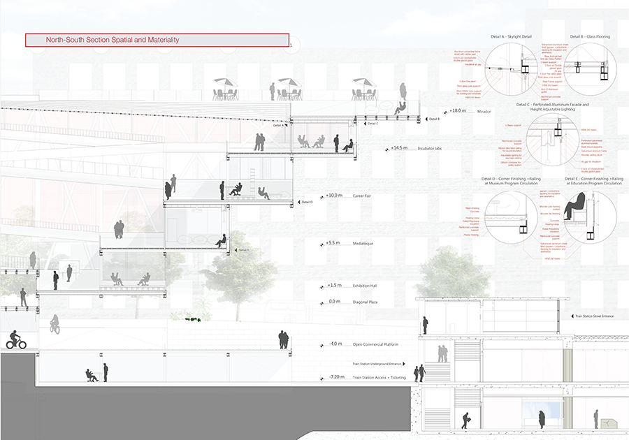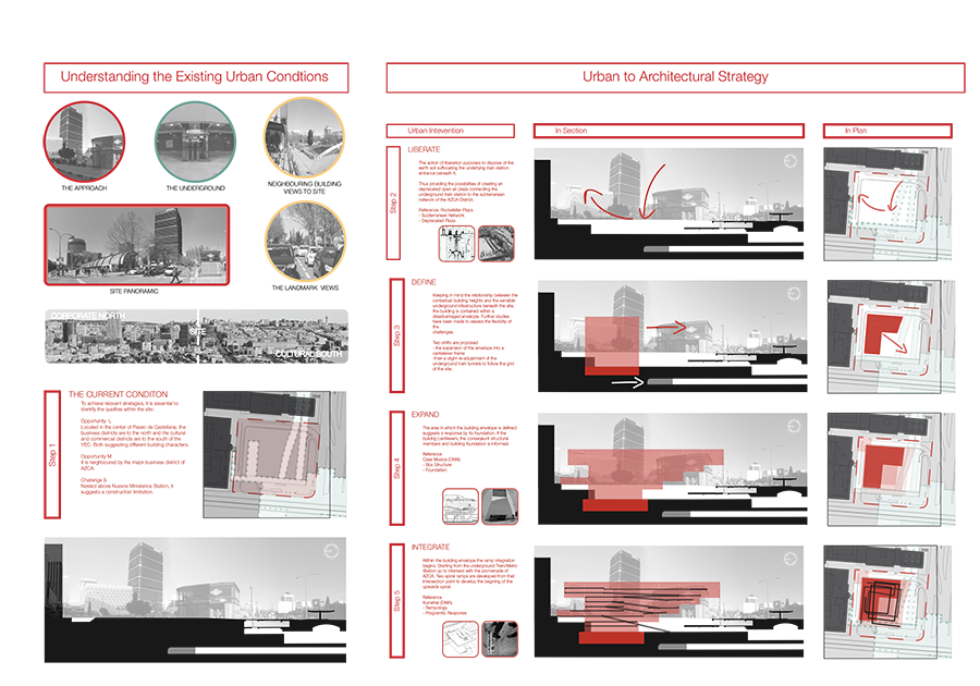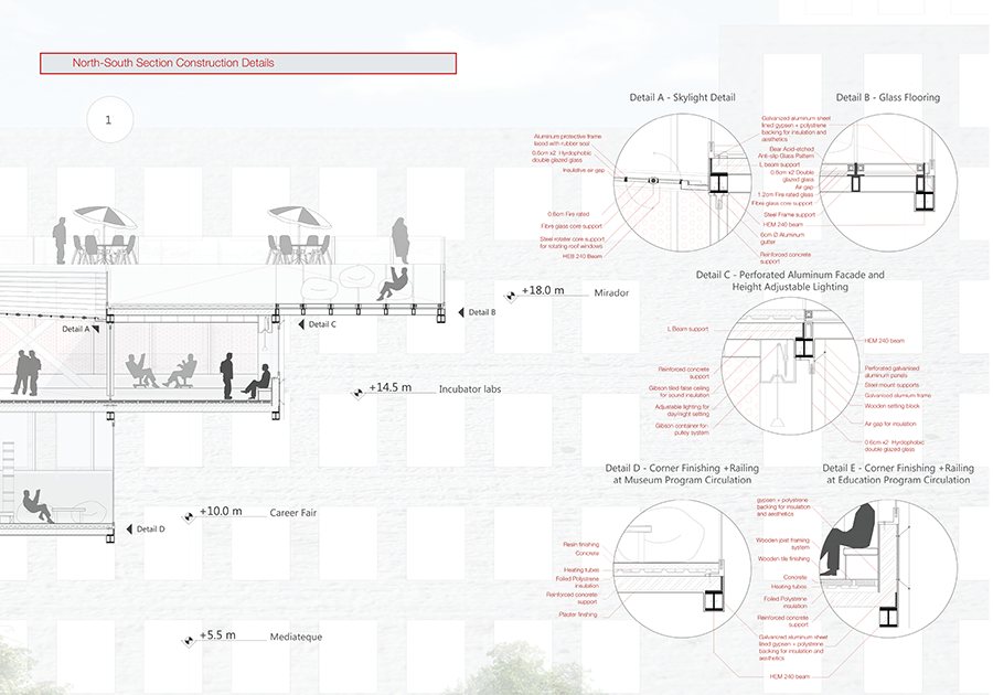 The project functions as a hybrid program of an idea incubator, i.e., a hub for business development, skill networking and investor haven for international entrepreneurial youth. This is complemented by a museum exhibiting the currently developing start-ups and the previously successful start-ups within the contextual views of the city, the business district to the north and the historical and cultural south of Madrid.